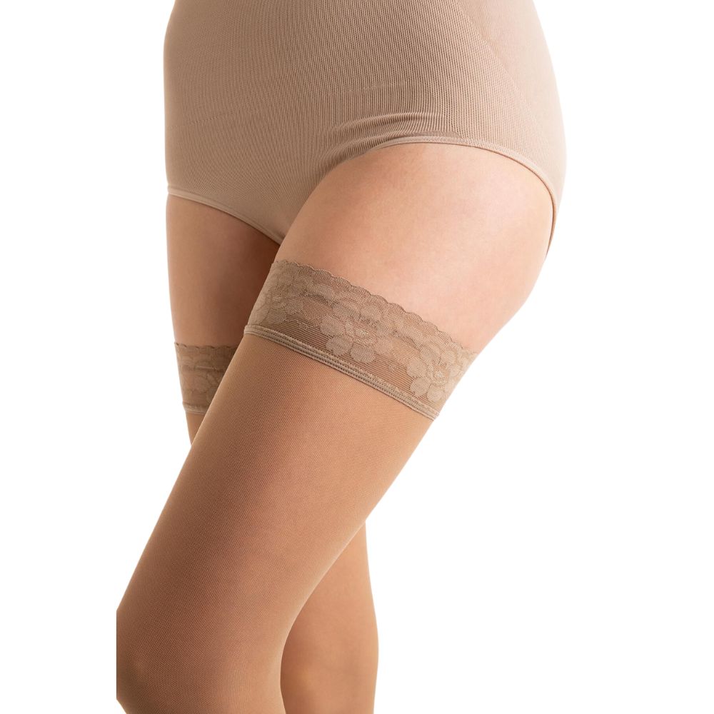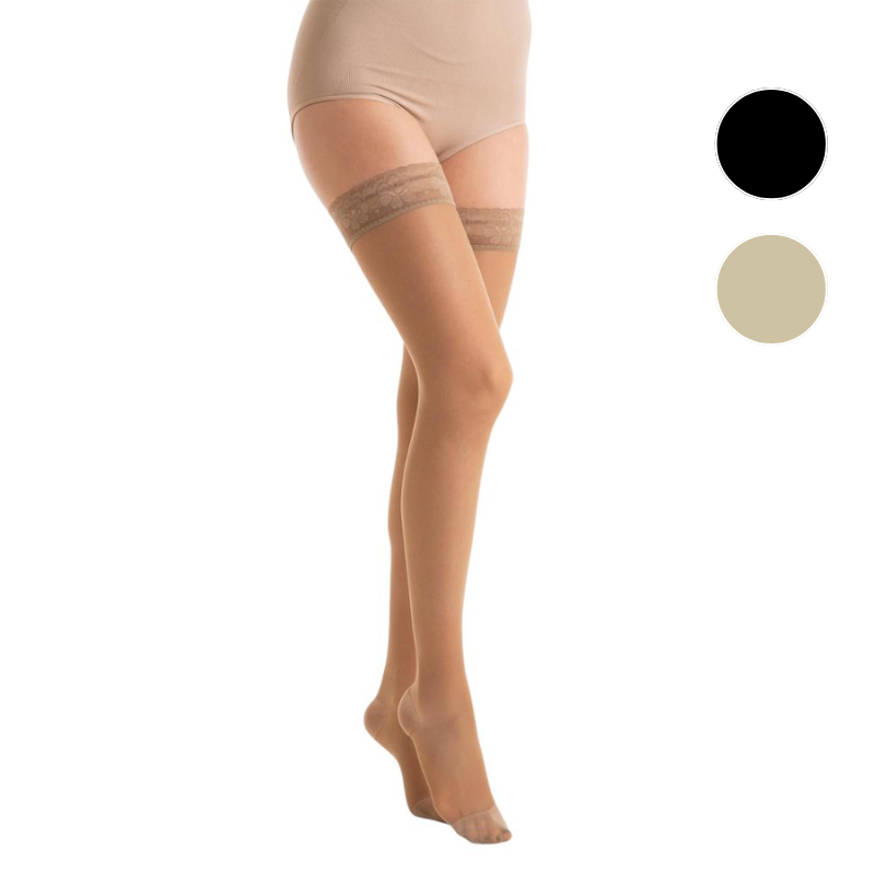 Relaxsan Basic klasikinė profilaktinių kompresinių kojinių linija. Šios 70 den ir 140 den kojinės iki kirkšnies su lipnia nėrinių juosta yra permatomos, skaidrios. Visada atrodysite elegantiškai!