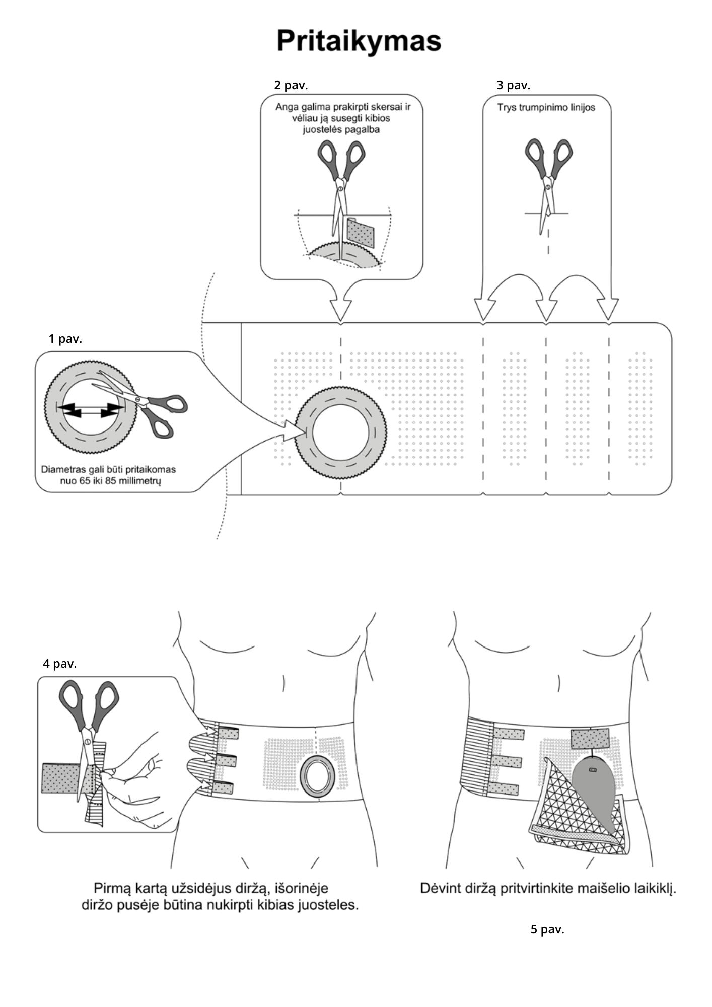 Diržą galima sutrumpinti pagal apimtis, naudojant specialias įpjovas (atsižvelgiant į nurodytus matmenis).